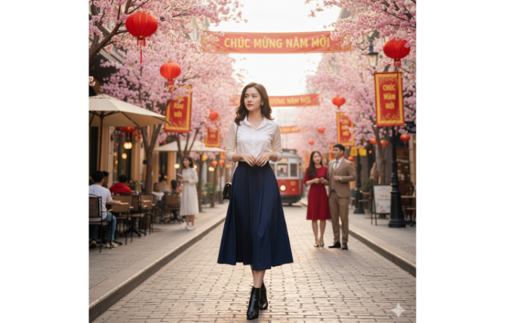 Nếu muốn vừa trẻ trung vừa thanh lịch, bạn có thể chọn chân váy chữ A hoặc midi mix cùng áo sơ mi trắng hoặc áo len mỏng. Bộ đôi này cực kỳ phù hợp với không khí đầu năm, tạo cảm giác nhẹ nhàng nhưng vẫn cuốn hút. Chỉ cần thêm một đôi boot cổ ngắn hoặc giày bệt, bạn đã có ngay một outfit phối đồ ngày Tết vừa xinh xắn, vừa tiện lợi cho cả ngày dài di chuyển.